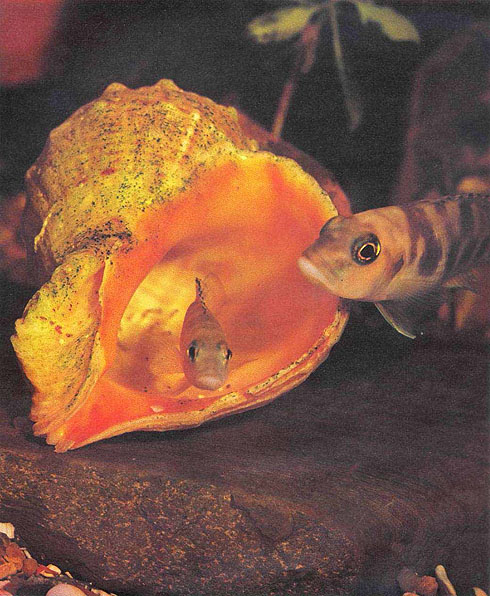 Пара лампрологусов Мееля (Neolamprologus meeli) охраняет раковину с мальками