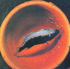 В заключение следует упомянуть еще о методе стимуляции с использованием феромонов – веществ, выделяемых рыбами в процессе нерестовых игр, самого нереста, охраны икры. Работы по изучению феромонов как химических сигналов рыб наиболее актуальны в ихтиологической науке. Если удастся феромоны синтезировать, то это достижение, несомненно, будет иметь огромное практическое значение. А пока аквариумисты-разводчики твердо знают, что для того, чтобы стимулировать нерест у молодых рыб или, как они выражаются, «разметать молодняк», лучший способ – это добавить воды из аквариума, в котором только что отнерестились их более опытные и взрослые собратья. При хорошей подготовке молодых производителей метод работает очень надежно. Но получение икры, личинок и мальков – это только еще полдела. Следующий, не менее важный этап – выращивание молоди. Особенно трудно вырастить молодь морских рыб, так как личинка у них очень мала. В любом случае любитель должен быть готов выкормить потомство с первого же раза, так как второй возможности может больше не представиться из-за болезни и гибели хотя бы одного из производителей, что, к сожалению, происходит не так уж редко, особенно с нежными рыбами.