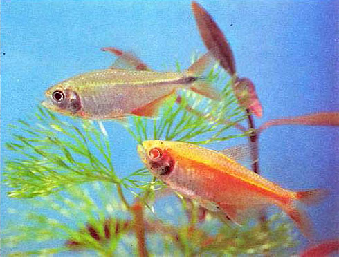 Самое большое семейство подотряда харациновидных – харациновые (Characidae) насчитывает около 700 видов. Яркая окраска с фосфоресцирующими, как бы светящимися, пятнами и полосками (рода Hemigrammus, Hyphessobrycon, Paracheirodon), неприхотливость и простота в содержании сделали этих рыб желанными в декоративных аквариумах. Среди харациновых следует выделить группу рыб, предпочитающих несколько более жесткую воду, чем остальные. Это прежде всего астианаксы (включая удивительную слепую пещерную рыбку Astyanax fasciatus mexicanus), афиохараксы и прионобрама. Для успешного разведения красного неона, петителлы, родостомуса лучше использовать, наоборот, очень мягкую, дважды дистиллированную или обессоленную воду с достаточно кислой реакцией (рН 5,0–5,8).