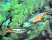 Неон голубой (Paracheirodon innesi) – слева, неон красный (Paracheirodon axelrodi) – справа |