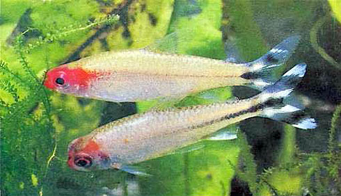 Тетрагоноптерус (Hemigrammus caudovittatus). Вверху обычная форма, внизу – альбиносная