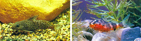 Синодонтис (Synodontis sp.). Малек — справа, подросток — слева