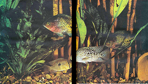 Многие виды американских цихлид успешно размножаются в неволе, откладывая икру на предварительно очищенный субстрат: камень, лист растения. Для размножения лучше всего подбирать пару производителей из стайки выращенных совместно 8–10 мальков. В этом случае самцы и самки сами находят друг друга и, отделяясь от общей стаи, занимают понравившийся им в аквариуме уголок, ревностно охраняя его от соседей. «Пара отошла»,– говорят любители.