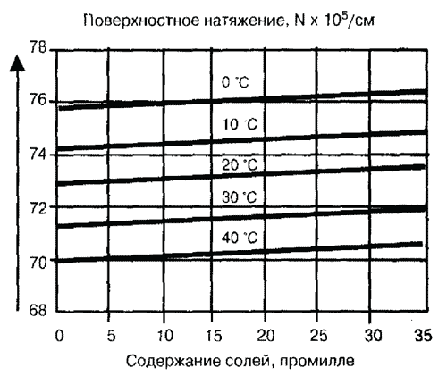 Поверхностное натяжение зависит от температуры воды и от содержания солей