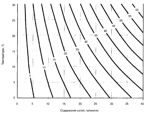 Удельная электрическая проводимость (мСм/см) в зависимости от содержания солей и температуры воды