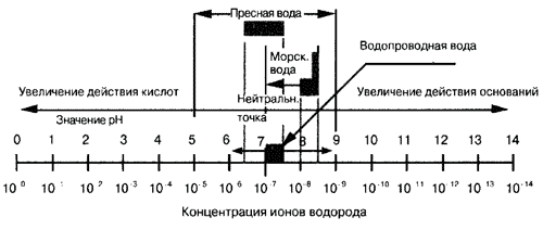 Значения pH для пресной воды варьируют около нейтрального значения pH, у водопроводной и морской воды pH выше