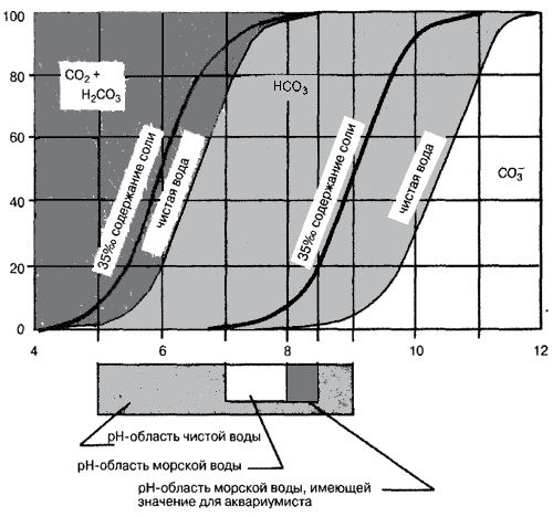 Соотношение углекислого газа и анионов угольной кислоты в воде в зависимости от pH (кривые для морской и пресной воды)