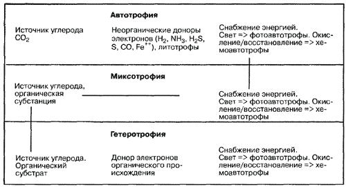 Микроорганизмы подразделяются на гетеротрофные и автотрофные. Под автотрофными организмами понимают зеленые растения, водоросли и микроорганизмы, которые могут питаться неорганическими веществами: минеральными солями, двуокисью углерода. Дальнейшая классификация микроорганизмов ориентирована на виды источника углерода, получения энергии, отдаче электронов. Важнейшая подгруппа литотрофные организмы, которые используют неорганические доноры электронов, такие, как водород, аммиак, сероводород, сера, монооксид углерода или железо (Fe2+). В качестве источника углерода используется неорганический оксид углерода, большей частью в форме двуокиси углерода. Энергию, необходимую для фиксации углерода, может поставлять свет. Этот процесс называется также фотоавтотрофией. Другим источником энергии являются окислительно-восстановительные реакции. Такое питание называется хемоавтотрофией, или хемолитотрофией. Таким образом питаются важные группы бактерий нитрификации и денитрификации. В противоположность автотрофным, гетеротрофные организмы получают углерод из органических соединений. Большая часть бактерий принадлежит к этой группе. Так же как и при автотрофии, для гетеротрофии важен способ получения энергии и характер передачи электронов. Большая часть гетеротрофных бактерий получает энергию из органических соединений; некоторые, однако, – из света или посредством окисления неорганических соединений. Важнейшая гетеротрофная группа бактерий – денитрифицирующие бактерии, которые получают углерод из таких органических соединений, как метанол, этанол, целлюлоза, меласса или уксусная кислота. Миксотрофами называют микроорганизмы, у которых снабжение энергией происходит путем окисления неорганических веществ, а углеродом – из органических веществ.