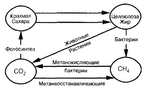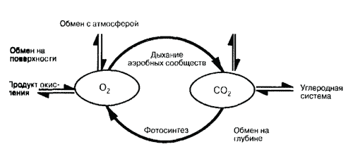 Растения используют углерод из двуокиси углерода для того, чтобы из него построить органическую субстанцию. При этом они не используют избыточный кислород, который поступает в окружающую среду. Поэтому вода сильно заросших прибрежных зон содержит много кислорода. Все водные существа используют этот кислород. Рыбы вдыхают его через жабры и выдыхают двуокись углерода. При аэробном разложении бактериями расходуется кислород и выделяется углекислый газ. Кислород и углекислый газ не остаются только в этом цикле, так как они принимают участие в обмене с атмосферой. При аэробном окислении кислород может быть связан в нитраты, а также в сульфаты, в то время как углекислый газ поглощается карбонатной системой. Растворимость углекислого газа повышается с увеличением давления, поэтому его содержание увеличивается с глубиной. Вблизи поверхности воды угольная кислота находится в дефиците. Это приводит к тому, что карбонат кальция, используемый кораллами, содержится в большом количестве. Одновременно вблизи водной поверхности повышается содержание кислорода. С глубиной запас он быстро истощается. Поступление кислорода в эти слои воды происходит только с глубокими течениями. На большой глубине нельзя получить кислород, так как из-за недостаточного освещения не может осуществляться фотосинтез. Как уже упоминалось выше, растения поглощают углерод из двуокиси углерода и строят органическое вещество, прежде всего углеводы. Из углерода растения создают целлюлозный каркас, а животные нуждаются в этих веществах, чтобы получить жиры. Жир используется как источник энергии при сжигании или превращается в двуокись углерода, которая выделяется в результате дыхания или перерабатывается бактериями в метан (CH4), который снова другими бактериями окисляется до двуокиси углерода. В присутствии метана преобладает сильно восстанавливающая среда, малопригодная для жизни. Образование метана происходит в определенных условиях (восстановлении) и может быть полностью исключено в аквариуме.