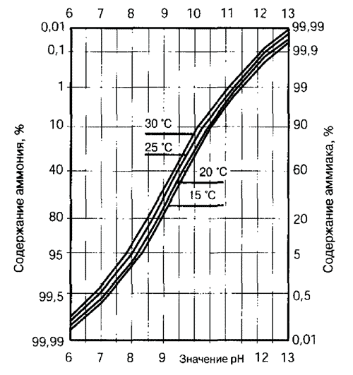Соотношение аммония и аммиака в воде зависит от pH и температуры