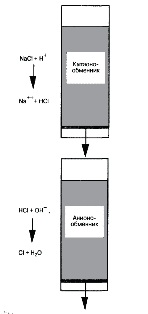 Для полного удаления солей катионообменник и анионообменник подключают последовательно