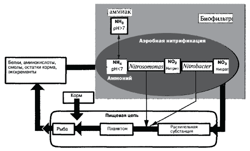 Самыми важными обитателями биофильтра являются бактерии Nitrosomonas и Nitrobacter. Nitrosomonas окисляют токсичный аммиак до нитритов, в то время как Nitrobacter перерабатывают ядовитые нитриты в нитраты. Подробнее процесс описан в главе «Биологические основы». Благодаря строго аэробной среде, для этих бактерий создаются оптимальные условия. Очень важно то, что органический: азот полностью окисляется до нитратов. Нельзя этот процесс представлять таким образом, что неиспользованная порция корма немедленно бы полностью перерабатывалась. Бактерии работают медленно, но постоянно. Концентрация токсичных веществ увеличивается постепенно до критического уровня. Если функционирует биофильтр, то он может удалить ядовитые вещества посредством биологического окисления в том же количестве, и котором они поступают. Конечная ступень окисления – нитраты, которые аэробными бактериями далее не могут перерабатываться. Но большая часть водных обитателей реагирует на относительно высокую концентрацию нитратов толерантно. Так концентрация около 50 мг/л приемлема, в то время как аммиак и нитриты ядовиты уже при концентрации 1 мг/л. Если присутствие нитратов все же нежелательно, то необходима прежде всего смена воды. В морской воде флотатор способствует тому, что белковые соединения удаляются из цикла до того как они будут разлагаться далее.