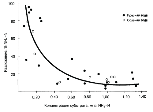 Разложение аммония в погруженном биофильтре зависит от концентрации субстрата