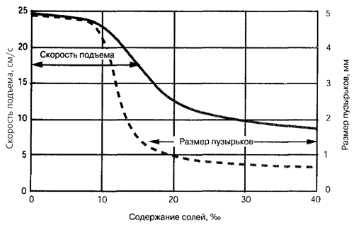 Диаметр пузырьков и скорость их подъема зависят в основном от содержания солей