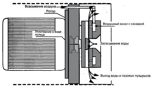 Принцип действия диспергатора основывается на тех же законах, что и инжектора. Поток воды ускоряется так сильно, что в определенном месте возникает вакуум и вследствие этого пузырьки воздуха засасываются в воду. В диспергаторе соединены в одном агрегате функциональные элементы водяного насоса и инжектора. Ротор, который специально создан для диспергатора, приводится в действие непосредственно мотором, так же как у центробежного насоса. Когда колесо ротора вращается, в непосредственной близости от оси возникает пониженное давление. Вода всасывается перегородками колеса и с повышенным давлением и высокой скоростью устремляется наружу. Благодаря высокой скорости воды, между вращающимся колесом и всасывающей тарелкой возникает, так же как в инжекторе, пониженное давление, воздух по круговому каналу всасывается в воду, и образуется мелкопузырьковая смесь. Это только один из примеров диспергатора, в настоящее время разработано множество подобных конструкций. Самым известным и самым простым является непосредственное введение воздуха в засасывающее устройство центробежного насоса. Принцип действия подобных диспергаторов в большинстве случаев очень хорош и убедителен. Но тем не менее возникает проблема, которая до сих пор технически недостаточно проработана. Мы уже упоминали выше, что смесь из воздуха и воды – «неньютоновская жидкость». В корпусе ротора возникают неопределенные состояния давления, которые из-за бегущего колеса производят колебания, которые через вал передаются на торцевое уплотнение или на подшипниковый вал магнита. Эти колебания часто приводят к повреждениям на уплотнении или на подшипниковой системе.