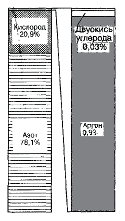 Таблица вверху еще раз поясняет пропорциональное содержание газов в окружающем нас воздухе. Ясно, что одного азота в воздухе содержится 78%, а азот вместе с кислородом составляют уже 99%.