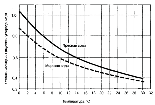 Как и для кислорода, так и для углекислого газа считается, что при повышении температуры растворимость снижается. Очевидно, что пресные воды могут поглощать диоксида углерода больше, чем морские. Двуокись углерода будет в дефиците в сильно заросшем растения-ми аквариуме. В природе только небольшая часть водной поверхности заселена растениями, так что имеется весьма благоприятное соотношение общей водной поверхности, которая может поглощать диоксид углерода, и поверхности с растениями, на которой диоксид углерода используется. Аквариумы с пресной водой, сильно заросшие растениями, нуждаются в большем количестве диоксида углерода, чем его может поглотиться через аэрацию или водную поверхность. Следовательно, необходимо дополнительное дозирование двуокиси углерода.