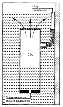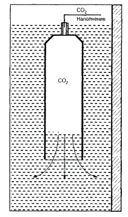 Чем больше снижение концентрации двуокиси углерода, тем быстрее происходит процесс диффузии. Рисунок на стр. 118 внизу показывает устройство для диффузии без мембраны. Двуокись углерода подается сверху; в противном случае верхняя сторона устройства закроется. С нижней стороны труба закрыта. При введении трубы шланг для двуокиси углерода снимается, так что во время погружения он полностью деаэрирован.
