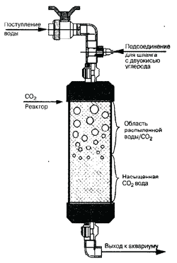 Небольшой поток цикла фильтрации подводится сверху через реакционную трубу. Выход из трубы ведет в аквариум. Двуокись углерода вводится также с верхнего конца. Она поступает вместе С Водой в реакционную трубу. Верхним часть трубы заполняется двуокисью углерода, так что вода орошает практически чистую двуокись углерода, расположенную над наполнителем. При этом вода очень быстро насыщается газом. С помощью точного регулирующего вентиля на редукторе расход двуокиси углерода устанавливается так, что труба заполняется газом максимум на две трети. В нижней части должна быть вода без пузырьков. Для того чтобы это можно было контролировать, реакционные баллоны должны быть изготовлены из прозрачного материала. Регулировка системы может быть такой точной, что потери двуокиси углерода исключаются.