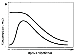 Данные по циклам указывают длительность обработки. Следовательно, разложение желтых веществ тем интенсивнее, чем длительней производится обработка озоном. Поэтому очень важно наряду с биологической потребностью в кислороде рассматривать также химическую потребность, которая связана с трудноразлагаемыми веществами. Рисунок на стр. 126 показывает очень важную взаимосвязь применения озона со снижением органической нагрузки. Озон окисляет молекулы с длинной цепью, значение химической потребности вначале снижается медленно, затем с продолжением окисления все быстрее. Окисление проводится не сразу же до конечной стадии (CO2). Вначале на промежуточной стадии получаются молекулы с более короткой цепью, и это приводит к поразительному эффекту – при этих условиях повышается биологическая потребность, неперерабатываемые до сих пор органические вещества из-за применения озона трансформируются так, что могут далее перерабатываться бактериями. Окисление озоном в этом случае не следует продолжать, так что используется относительно небольшое количество озона.