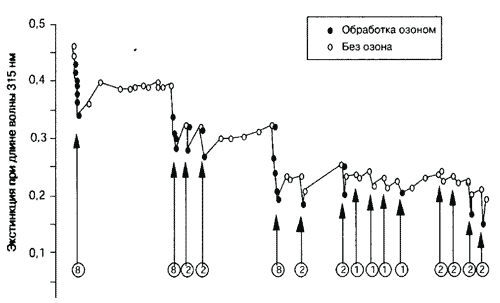 Желтые вещества приводятся здесь в качестве примера веществ, которые не разлагаются биологически и поэтому не включаются в значения биологической потребности в кислороде. Когда бактерии не в состоянии разрушать желтые вещества, это осуществляется с помощью озона. Рисунок внизу приблизительно показывает увеличение разложения органических веществ озоном. В связи с этим экстинкция света при введении озона отчетливо уменьшается, в то время как без обработки озоном опять повышается: