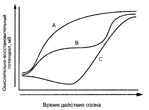 Окисляющие вещества – кислород и еще в большей степени озон. Чем больше восстанавливающих веществ содержится в воде, тем ниже опускается окислительно-восстановительный потенциал. Чем больше имеется окисляющих веществ, тем выше значение окислительно-восстановительного потенциала. Следовательно, мы имеем возможность противодействовать негативному действию восстанавливающих веществ через повышение окислительно-восстановительного потенциала. Но этого большей частью не происходит. На рисунке стр. 127 вверху справа отражены три типичных кривые протекания процесса. Вначале рассмотрим первую А. Эта кривая описывает процесс в относительно чистой воде. Сначала окислительно-восстановительный потенциал остается почти постоянным или очень слабо повышается, и только лишь после значительного времени от начала процесса он поднимается, но потом достаточно быстро достигает стабильного уровня, который при увеличении дозировки озона больше не повышается. Кривая B в начале показывает подобное течение процесса. Спустя значительное время окислительно-восстановительный потенциал снижается. Только лишь после продолжительной дозировки озона он опять повышается и достигает наконец уровня, изображенного на кривой А. Как можно объяснить такой вид кривой? Когда идет описание кривой А, мы имеем дело с чистой водой, в случае с кривой B – это уже вода с определенными загрязнениями. Вещества загрязнений окисляются озоном, когда вода уже достигла определенного значения окислительно-восстановительного потенциала. Дальнейший подъем окислительно-восстановительного потенциала возможен, если они окислились. Кривая С показывает совсем другое течение процесса. Здесь имеются существенные органические загрязнения воды. Часто содержащиеся в воде вещества этого вида не разлагаются биологически. Если такую воду обработать озоном, то эти вещества достаточно быстро разлагаются на более короткие молекулярные цепи, которые разрушаются легче. Теперь за короткое время большое число органических веществ доступно для биологических ре-акций, которые действуют так, что окислительно-восстановительный потенциал снова заметно снижается.
