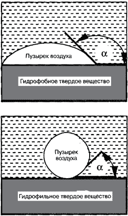 Как уже описывалось в главе о флотаторе, при прилипании пузырька к поверхности образуется пограничная поверхность, которая определяется трехфазной системой. При этом большое значение имеют гидрофильные или гидрофобные свойства вещества. Гидрофобное вещество будет скорее контактировать с воздушным пузырьком, чем с водой. Пузырек воздуха, который контактирует с гидрофобным веществом, легко располагается на его относительно большой и стабильной поверхности.