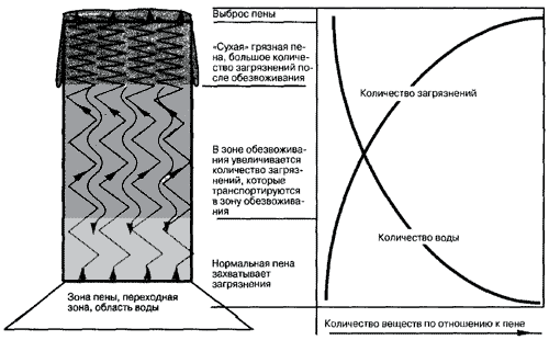 Описанные выше белковые молекулы играют также важную роль при образовании пены. Если загрязненный пузырек газа с белковыми молекулами и частицами достигает поверхности, он освобождает свои загрязнения, так как разрывается или сливается с другими пузырьками.
