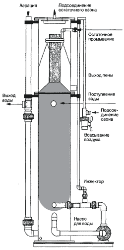 Зона С внутри трубы с пеной является, по существу, зоной накопления. Здесь сильно сконцентрированы загрязнения в пене, и удаляется остаточная вода, В зависимости от регулировки и накопления грязи, грязная пена может так сильно концентрироваться, что она отводится в ковш для пены совсем сухой. Выпуск пены из зоны С должен происходить без помех. Поэтому нужно обязательно предусмотреть ковш для пены нужного размера. Сужения в трубе, приводящие к выбросу пены в контейнеры, расположенные рядом, должны исключаться. Они быстро забиваются и снижают степень действия пенообразователя.