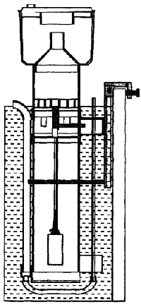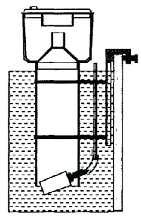 На рисунке справа изображен аэратор усовершенствованного принципа. Немного ниже поверхности находятся входные отверстия, через которые вода может поступать в реакционную трубу. Оборот волы происходит по принципу засасывающего насоса. В маленькой трубке поднимающиеся пузырьки воздуха несут воду вверх и таким образом способствуют обмену воды. В нижнем конце реакционной трубы находится распылитель из дерева, который образует для флотатора необходимые мелкие пузырьки. В этом маленьком приборе осуществлен принцип противотока, который сегодня широко применяется в конструкции флотаторов. Вода поступает вверх, в реакционную трубу, и течет вниз в противотоке с поднимающимися вверх пузырьками воздуха. Таким образом, загрязнения, поступившие с водой, уносятся с потоком пузырьков, а устройство характеризуется рядом преимуществ. Его производительность, однако, остается ограниченной небольшим количеством воды. Можно рекомендовать этот флотатор в качестве дополнения к хорошо функционирующему фильтровальному устройству в аквариумах объемом до 200 л.