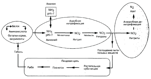 Рисунок на стр. 55 упрощенно приводит цикл азота в природе. Так как в нашем аквариуме природное равновесие не сохраняется, мы должны вмешиваться в этот процесс. Причинами отсутствия равновесия являются, например, «перенаселение», слишком интенсивное кормление и ограниченное «биологическое пространство».