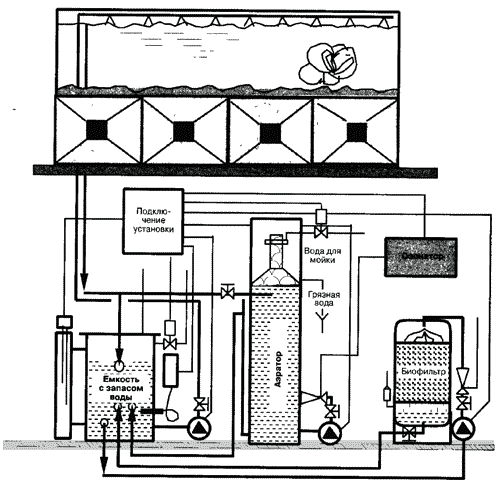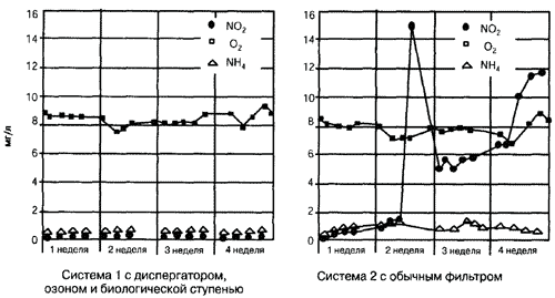 Рисунок вверху приводит результаты интересного эксперимента, который был проведен на исследовательской ядерной установке (Aivasidis и Wandrey). Диаграмма слева представляет данные, полученные на установке, которая была оснащена пенообразователем с культурами бактерий и подачей озона. Для сравнения один аквариум был оборудован обычным фильтром, использующим воздух, который затем спустя определенное время отсоединялся. Результат можно видеть на правом рисунке. В то время как содержание аммония возрастало слабо, повышение количества нитрита спустя неделю регистрировалось отчетливо, на диаграмме видны пики. В прошлом часто дискутировали на тему: «Пенообразование или биологическая фильтрация», «Может ли озон применяться одновременно с биологической фильтрацией?». Если много заниматься химией, понимаешь, как важно учитывать синергические эффекты, которые возникают, если пенообразование, бактериальное разложение и озон комбинировать осмысленно. Схемы таких комбинированных систем на строящихся установках показаны на стр. 144, 145.