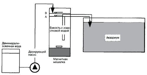 На рисунке (стр. 153) показано дозирующее устройство для известковой воды. Дозирующий насос засасывает деминерализованную воду из резервуара и переносит ее в сосуд с известковой водой, который стоит на магнитной мешалке, это способствует тому, что оксид кальция и гидроксид кальция могут постоянно перемешиваться.