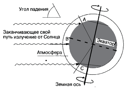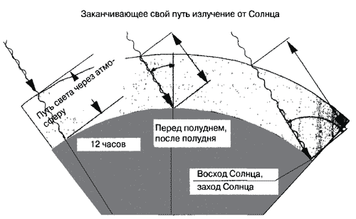 Солнце удалено от Земли примерно на восемь световых минут. За эти восемь минут свет проходит большое расстояние, не изменяясь в вакууме космического пространства. Только в конце пути, незадолго до того как упасть на Землю, он подвергается значительному влиянию земной атмосферы. Интенсивность световой энергии, приходящаяся на земную поверхность, зависит прежде всего от географической широты и долготы. Чем дальше удаляется наблюдатель от экватора, тем более плоским становится угол паления солнечных лучей на земную поверхность, и тем ниже будет находится самое высокое положение солнца в полдень.