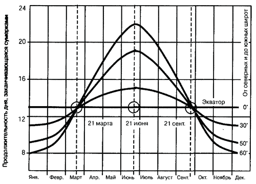 В продолжение дня положение Солнца снижается еще дальше. Чем ближе Солнце к горизонту, тем длиннее участок, на котором атмосфера действует на лучи, как фильтр. На высоте 10 – 50 километров расположен всем известный озоновый слой. Здесь из-за облучения кислорода ультрафиолетом возникает небольшая концентрация озона, которая все же достаточна из-за большой толщины слоя для поглощения ультрафиолетового излучения. Вследствие этого жизнь защищается от этого вредного ультрафиолетового излучения, которое не только преобразует кислород в озон, но может также разрушать живые клетки. Вместе с ультрафиолетом атмосферой также поглощается инфракрасное излучение. Из-за положения земной оси под углом к эклиптике в северных и южных широтах изменяется длина дня, больше там, где наблюдатель дальше удаляется от экватора. На экваторе день в течение всего года длится примерно 13 часов. Севернее и южнее в летние месяцы день становится длиннее, как это изображено на следующем рисунке.