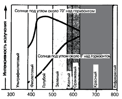 Мы все наблюдаем кроваво-красное солнце на утреннем и вечернем небе. Это свидетельствует о том, что при низком положении солнца спектр сдвигается в длинноволновую область. Это значит, что меньше синего и к тому же больше красного света встречается с водной поверхностью. Как мы убедимся далее, это имеет значительное влияние на действие света на глубине.