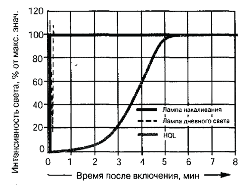 Только спустя несколько минут после включения достигает HQL-лампа своей полной световой интенсивности