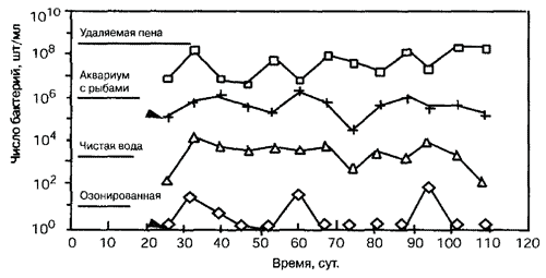 Диаграмма (стр. 172) показывает число микроорганизмов в различных точках системы водоподготовки, которая состоит из озонатора, механического фильтра и пенообразователя.