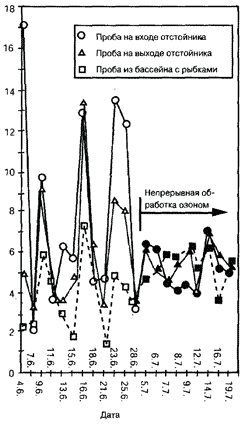 Как указывалось в главе об озоне, определенные органические соединения, которые вначале не разлагаются биологическим путем, после окисления озоном могут разлагаться в подключенном биофильтре. Положительное влияние озона на биологическую фильтрацию становится понятным из расположенной рядом диаграммы. В трех различных точках системы измерены значения БПК, а именно перед снятием фильтра, после снятия фильтра и в рыбном аквариуме. Перед обработкой озоном установилась очень большая разница между отдельными точками. Далее создавали экстремальные отклонения. Внезапные напряжения, действующие отрицательно на рыбную экосистему, признак того, что система не находится в равновесии. При включении обработки озоном пиковые значения тотчас смягчались. Органические нагрузки с одной стороны посредством озона, с другой стороны посредством бактериального разложения протекали успешнее. Вода возвращается при этом к необходимому качеству, и животные не подвергаются внезапным колебаниям условий среды. Это очень важно, так как животные не могут реагировать на внезапные колебания медленным выравниванием обмена веществ. Часто аквариумисты опасаются, что биологическая фильтрация с добавлением озонирования могла бы убивать нитрифицирующих бактерий на фильтровальном материале. Опыт показывает противоположное.