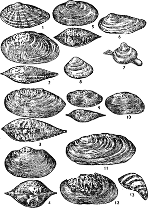 МОЛЛЮСКИ ДВУХСТВОРЧАТЫЕ: 1-5 — беззубки: рыбья, Седакова, Беринга, сводчатая и китайская соответственно; 6 — перловица клиновидная; 7 — шаровка речная; 8 — чечевичкица речная; 9, 10 — дальневосточная и восточноазиатсхая перловицы; 11, 12 — дуарская и камчатская жемчужницы; 13 — дрейссена речная.