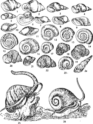 МОЛЛЮСКИ БРЮХОНОГИЕ: 1 — речная живородка; 2 — щупальцевая битиния; 3 — обыкновенный прудовик и сответственно болотный, малый, ушковый, угнетенный, овальный и вытянутый; 4 — 10, 11 — пузырчатая и заостренная физы; 12 — 17 — роговая, килеватая, завернутая, врученная, белая и дальнево-сточная катушки; 18 — 20 — амурская, чеканенная и уссурийскйя живородки; 21 — 22 — уссурийская и полосатая битинии; 23 — катушка роговая красная; 24 — мелания песчаная; 25 — крупная ампулярия; 26 — мариза «гуглоротая.