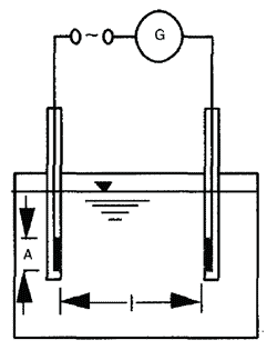 Ток между двумя электродами измеряют для определения электропроводности. Ее значение, кроме расстояния между электродами, зависит от площади электрода; зная эти величины, можно рассчитать удельную электропроводность |