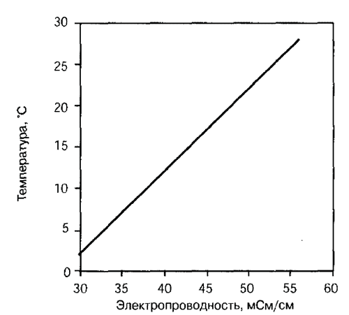 Эффективная электропроводность водного раствора значительно зависит от температуры, поэтому при сравнении двух значений следует убедиться в том, что они зафиксированы при одинаковой температуре. Зависимость проводимости от температуры следует определенной закономерности, так что измеренные при разных температурах величины могут пересчитываться на установленную стандартную температуру 25 °C. Расположенная ниже диаграмма показывает зависимость электропроводности от температуры в морской воде при концентрации 35‰.