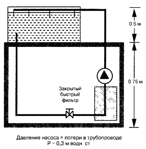 В закрытом быстром фильтре необходимо учитывать потерю давления в трубопроводе из-за трения, которое создается водным столбом, равным в нашем примере 0,3 м