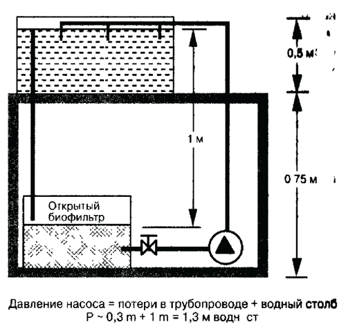 В большом открытом фильтре дополнительно к потере давления в трубопроводе за счет водного столба 0,3 м прибавляется величина водного столба, равная 1 м, и в общей сложности – 1,3 м водного столба