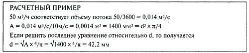 При 50 м3/ч компрессор создает напор 100 бар, что соответствует 1 м водного столба. Однако этого может быть мало для некоторых целей. Следует запланировать небольшой резерв и применять компрессор с большим противодавлением. При сомнениях уместно обсудить необходимую производительность имеющейся или запланированной установки с изготовителем или поставщиком. Всегда важно рассматривать всю потерю напора, т.е. сумму превосходящего напора воды, потерю в флотаторе, потерю в трубопроводе. Размеры трубопроводов получают, если скорость потока принимают 10 м/с. Тогда используют формулу V=Q/A или A=Q/V, причем V – скорость потока в м/сек, А – поперечное сечение трубы в м2, a Q – объем потока м3/с. В этом случае выбирается трубопровод с внешним диаметром от 50 мм. следовательно, с внутренним диаметром 40 мм. Приблизительный расчет дает для этого трубопровода в итоге потерю напора примерно 35 см водного столба при 10 поворотах в трубопроводе. Если компрессор 2 создает 1 м водного столба, то осталось бы 65 см напора, чтобы превысить давление аэратора и напор воды. Такой расчет очень приблизительный и может привести к заниженной производительности. Фактически следовало, как мы уже отмечали выше, выбирать компрессор по диаграмме 3. Другое решение – выбор большего диаметра трубопровода. Проверочный расчет дает: D = 63DN = 50 мм, потерю напора 15 см, 85 см для аэратора (флотатора) и напора воды. Теперь нужно решить, пригоден ли этот компрессор для данной установки или лучше выбрать более мощный.