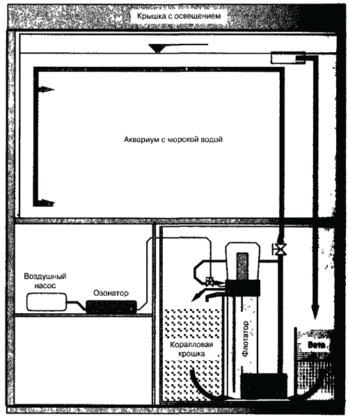 В приведенном примере, в частности, было показано, что размещение следует планировать так, чтобы аквариумная техника по возможности не была на виду. Вода течет на правой стороне аквариума через сливную трубу в расположенный под ней фильтр. Она протекает сначала через камеру предварительного фильтрования с тонким слоем ваты, который лежит на слое наполнителя (например, на керамических кольцах). Предварительное фильтрование должно улавливать только грубые загрязнения. Вату, однако, регулярно очищают. Из камеры предварительного фильтрования вода поступает в центральный сборник, куда стекает предварительно очищенная и чистая вода. Центробежный насос забирает воду из этой камеры. Транспортный поток из этого насоса распределяется. Приблизительно половина объема воды течет через распределительный трубопровод в аквариум. А другая половина отводится во вспениватель при аквариуме с морской водой. После того как вода очищена и насыщена кислородом, она протекает во включенный биофильтр. В этой установке нельзя исключить того, что биофильтр работает частично как разбрызгивающее устройство, а частично как погруженный биофильтр. Для небольших объемов погруженного материала это приемлемо, так как вода уже во вспенивателе насытилась кислородом. Кроме того, в погруженной области достаточно кислорода. Очищенная вода опять попадает в сборник для смешанной воды, откуда она насосом подается в аквариум.