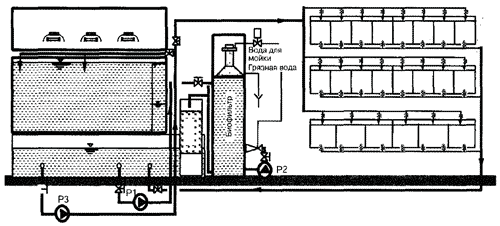 Следующий рисунок показывает установку с закрытым циклом. Она состоит из отдельного смотрового аквариума с объемом воды 2300 л. а также из установки с аквариумами меньшего размера для демонстрации и продажи рыб, находящимися на стеллаже, с общим объемом воды около 2600 л. Все аквариумы имеют отдельные камеры, из которых по открытому трубопроводу вода поступает в водосборник. Относительно длинная окантовка камеры, через которую течет вода, уменьшает турбулентность. При необходимости здесь можно использовать первую предфильтрацию через большие фильтровальные маты. При стоке получается так, что вода в сточной камере накапливается. Это исключает забор воздуха через отводную трубу. В сборную емкость поступает вода, как из смотрового аквариума, так и ИЗ установки для продажи рыбы. Она функционирует как в качестве сборника воды для транспортирующих насосов, так и в качестве резервуара для воды и выравнивающего аквариума. Для конструктивного исполнения подобных сборников важным является то, что они могут принимать еще некоторое количество воды, которое при поступлении из застойных зон аквариума попадает во вспениватель и биофильтр (см. «Водный сток» в главе «Трубопроводы» на стр. 223). В установке используется три транспортирующих насоса. Водный насос P1 транспортирует воду из сборника во вспениватель.