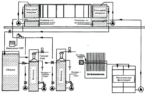 От него вода подходит к двум большим флотаторам (аэраторам), которые имеют диаметр 100 см и высоту 3,1 м. Флотатор соединен с озонатором, так что при необходимости в аквариумную воду может подводиться озон. Озон повышает окислительно-восстановительный потенциал, который в этой системе постоянно контролируется с помощью электроники. Из сборного резервуара вода попадает в получашу 2,2 м длиной и 2 м шириной, в которой на оси вращаются поставленные в ряд пластины из пластмассы диаметром 2 м. На этих наполовину погруженных в воду пластинах поселяются бактерии, которые окисляют высокотоксичные аммиак и нитриты в относительно безвредные нитраты. Механическое фильтрование происходит при подсоединении к биологическому, мокрому фильтру объемом 10 м3, заполненному коралловым щебнем. Он состоит из двух параллельно расположенных отсеков, через которые проходит половина объема воды. Таким образом, посредством изменения направления движения всего потока в одну камеру другую можно очищать в работающем режиме. При этом гравий можно очищать смесью воды и воздуха. Эту работу можно совмещать с частичной сменой воды, которая проводится, как правило, один раз в месяц. Два насоса с производительностью 60 м3/ч перекачивают очищенную воду в резервуар с осветленной водой, который находится непосредственно под аквариумом. Отсюда она с помощью двух следующих насосов опять транспортируется в кольцевидный аквариум. Все насосы управляются выключателем с поплавком, так что отказ насоса не приводит к авариям. Такой же фильтровальной техникой оснащен панорамный аквариум для коралловых рыб. Все другие аквариумы в зависимости от размеров и вида воды (морская или пресная) оборудованы собственными фильтровальными системами, причем, применяются как устройства, фильтрующие через песок под давлением, так и многокамерные гравийные фильтры с предварительным фильтрованием через фильтровальные маты. Наряду с фильтровальными системами к аквариумной технике относятся также освещение, аэрация, нагрев и охлаждение отдельных аквариумов, установки водоподготовки, дополнительные емкости, а также общие трубопроводы. Так, например, для включения воды и электричества во всех частях аквариума необходимо 10,5 км кабеля и 8 км трубопроводов. Большие, заросшие водорослями, аквариумы с пресной водой подсоединены к центральной установке для дозирования двуокиси углерода, в качестве удобрения, в аквариумную воду.