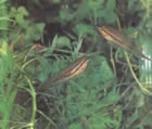 Близки к трихогастрам рыбы из рода Colisa. Небольшая рыбка (до 5 сантиметров) С. lalia – одна из самых красивых среди декоративных обитателей аквариума. Словами описать ее невозможно, лучше посмотрите на фотографию. Лялиусы требуют к себе весьма уважительного отношения: кристально чистой, аэрируемой воды температурой от 25° С, хорошего кормления, покоя среди зелени. Не любят они (как, впрочем, и все лабиринтовые) частой смены воды. Одна любопытная особенность: лялиус может сбивать насекомых над водой, выстреливая струйкой воды на расстояние до 5 сантиметров. Надо учитывать, что порой он обстреливает и горячую лампу.